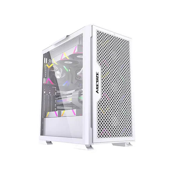 Aresze KT02W Mid-Tower Gaming Casing - White is designed for E-ATX and ATX motherboards. It features a tempered glass left side panel and a mesh front panel for optimal airflow. The case includes one USB 3.0 port, two USB 2.0 ports, and HD Audio. The pre-installed White ARGB fans (4 x 120mm) have an outer 16LED and inner 8LED and come with an extended cable motherboard connector and reset connector. The GPU cooler height limit is 340mm, and the CPU radiator height limit is 180mm. The case supports a 360 water cooler and vertical graphics card installation.